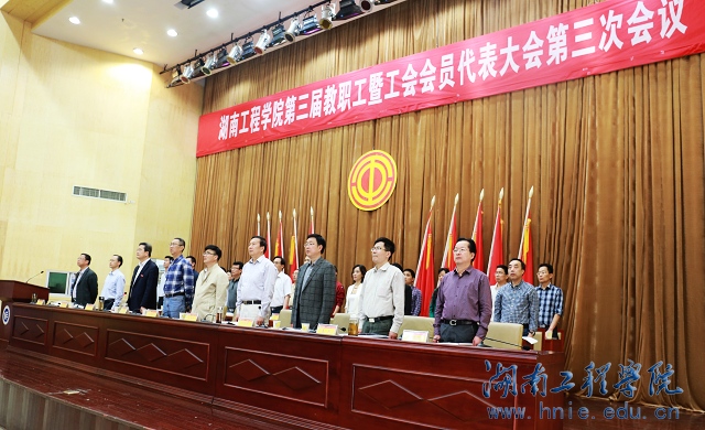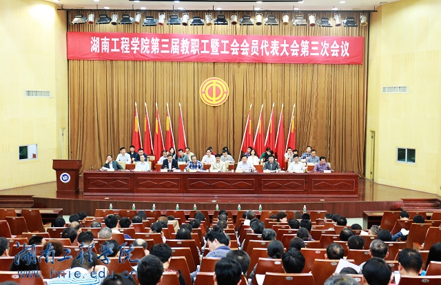 ,我校第三届教职工暨工会会员代表大会第三次会议在一报告厅召开,校领导刘国荣、刘国繁、彭晓、宁立伟、俞贵邦、易兵、李军林、刘建强、娄炳林出席会议,