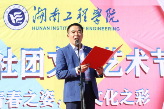 陈岳堂在开幕式上致辞,他代表学校向精心准备艺术节的师生们表示诚挚的问候和衷心的感谢。他指出,学校历来重视校园文化建设和文化育人工作,以校园文化、社团文化艺术节作为大学生思想政治教育的有效载体,引导全校师生培育和践行社会主义核心价值观,全面推进学校精神文明建设,搭建起大学生致力文化繁荣、服务社会、增长才干的实践舞台。他希望,广大湖工学子以饱满的热情积极投身活动,以创新的姿态迎接挑战,用精湛的水平书写青春,共同谱写学校校园、社团文化百花齐放的精彩华章。